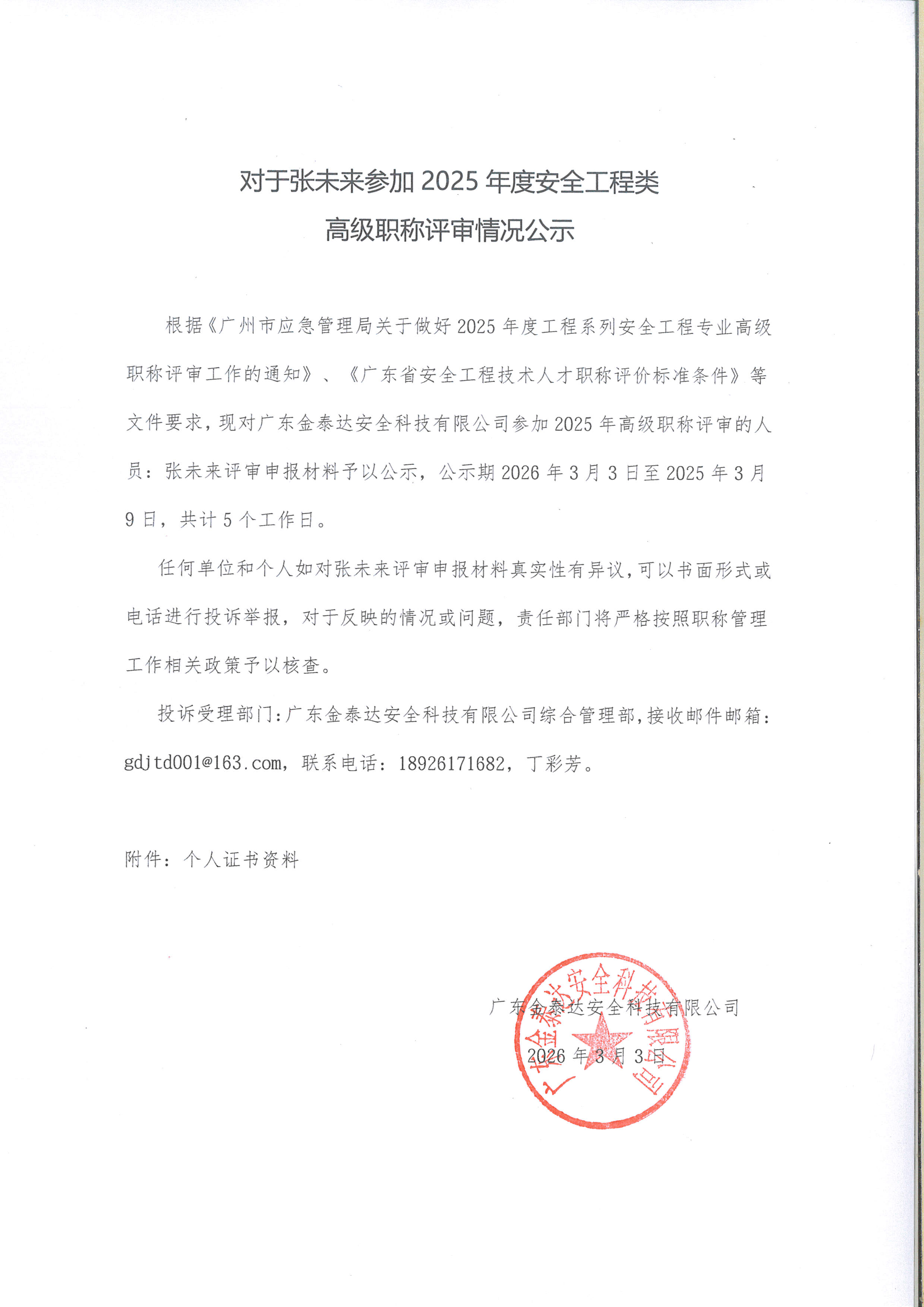 对于张未来参加2025年度安全工程类高级职称评审情况公示