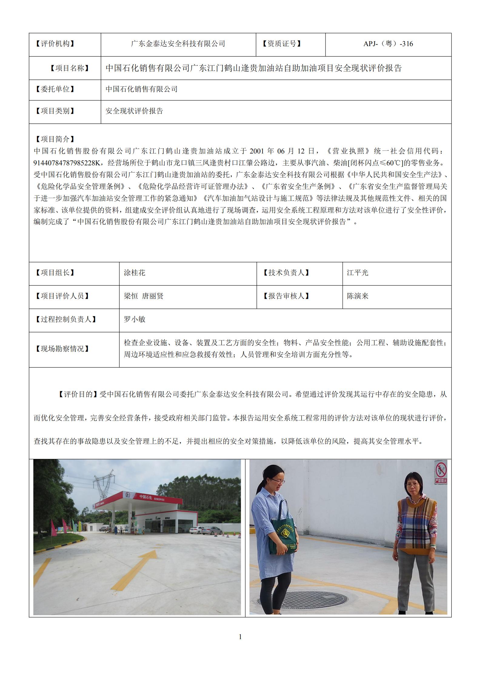 19681中国石化销售有限公司广东江门鹤山逢贵加油站自助加油项目安全现状评价报告
