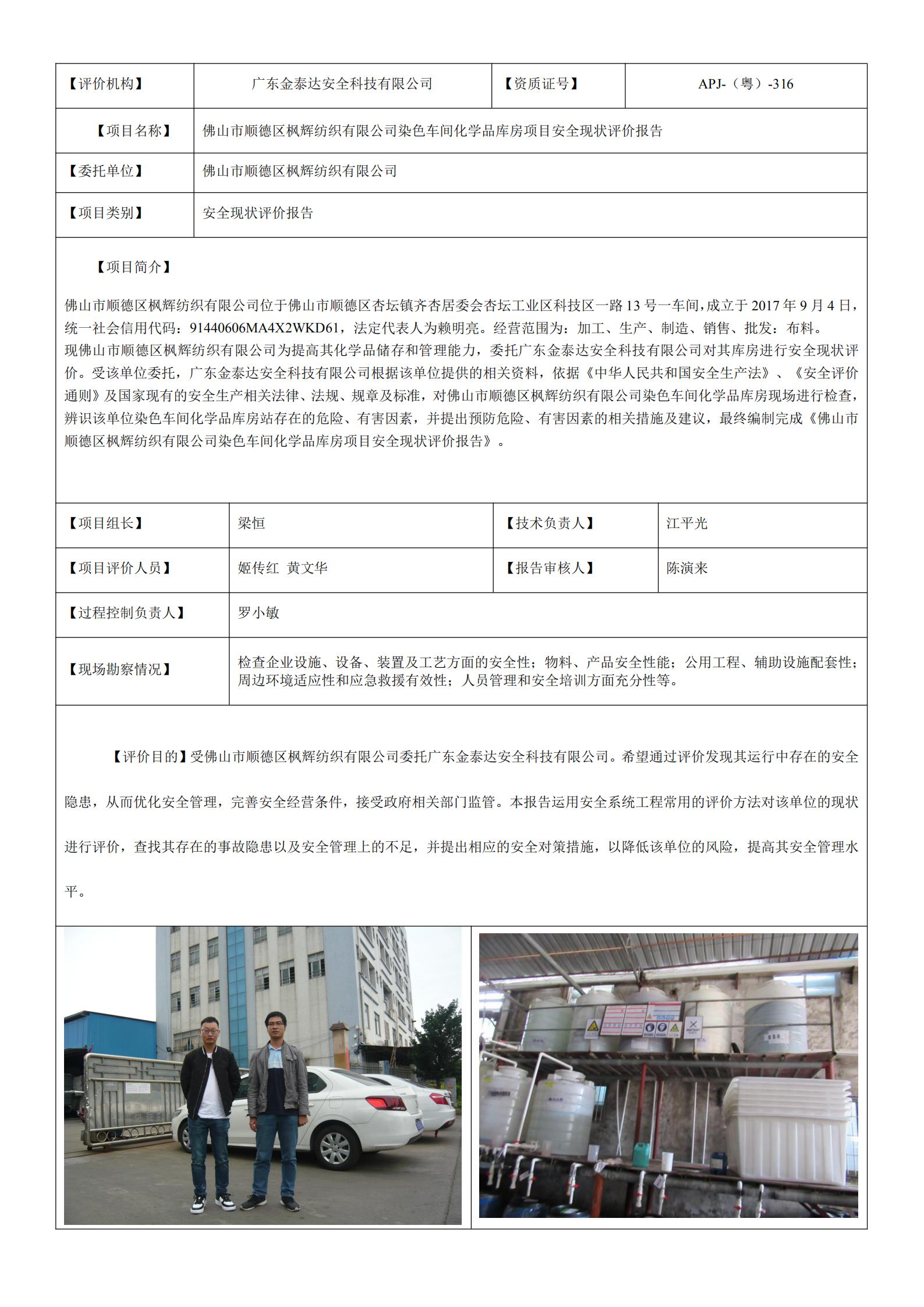 19704佛山市顺德区枫辉纺织有限公司染色车间化学品库房项目安全现状评价报告