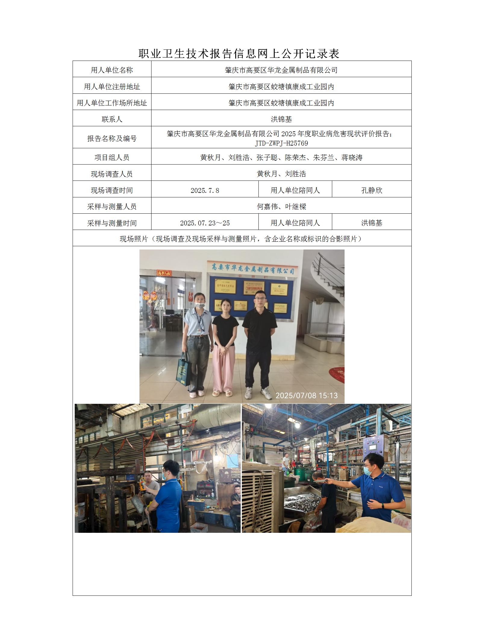 职业卫生-H25769肇庆市高要区华龙金属制品有限公司现状评价