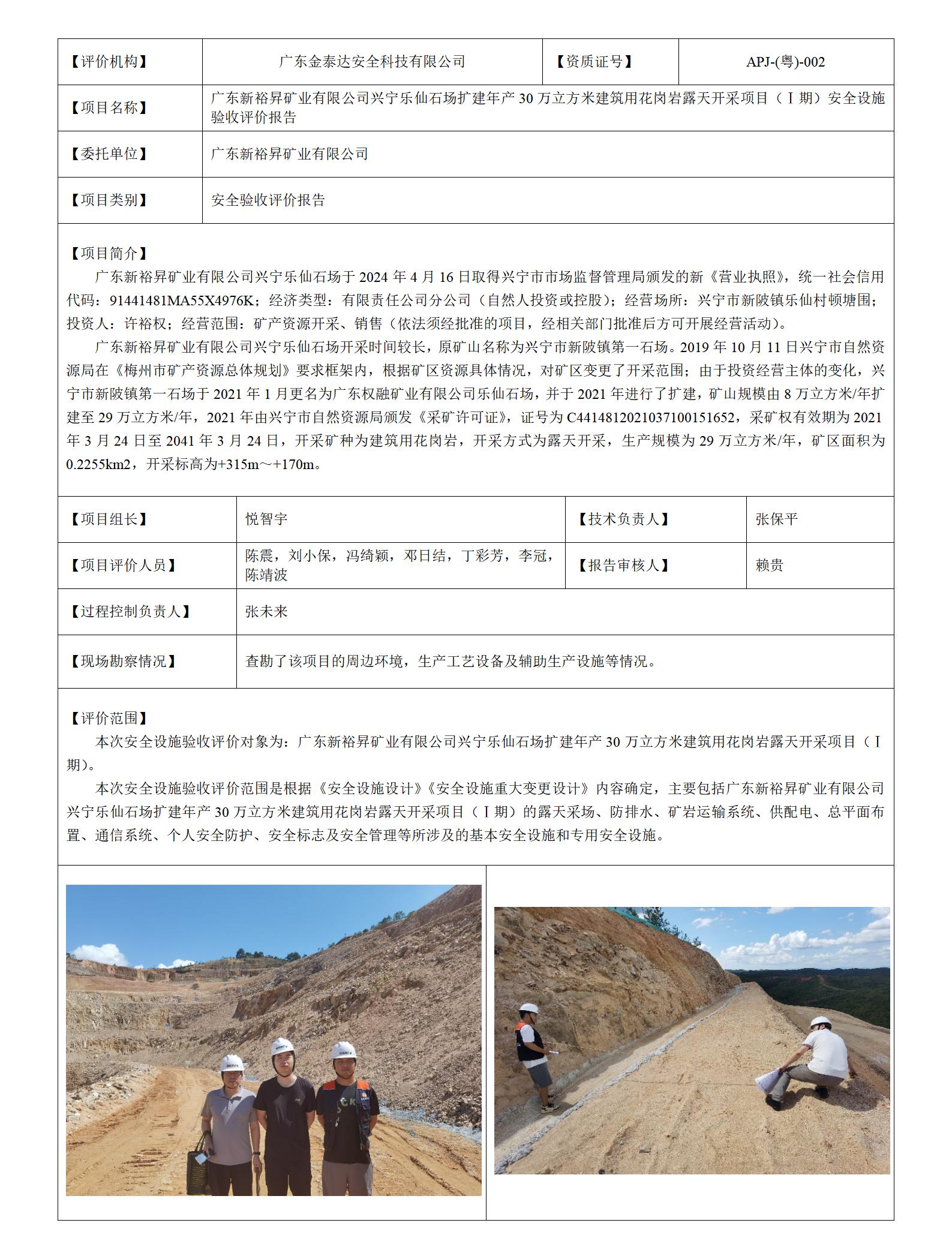 JTDG-KS2026-2广东新裕昇矿业有限公司兴宁乐仙石场扩建年产30万立方米建筑用花岗岩露天开采项目(Ⅰ期)安全设施验收评价报告