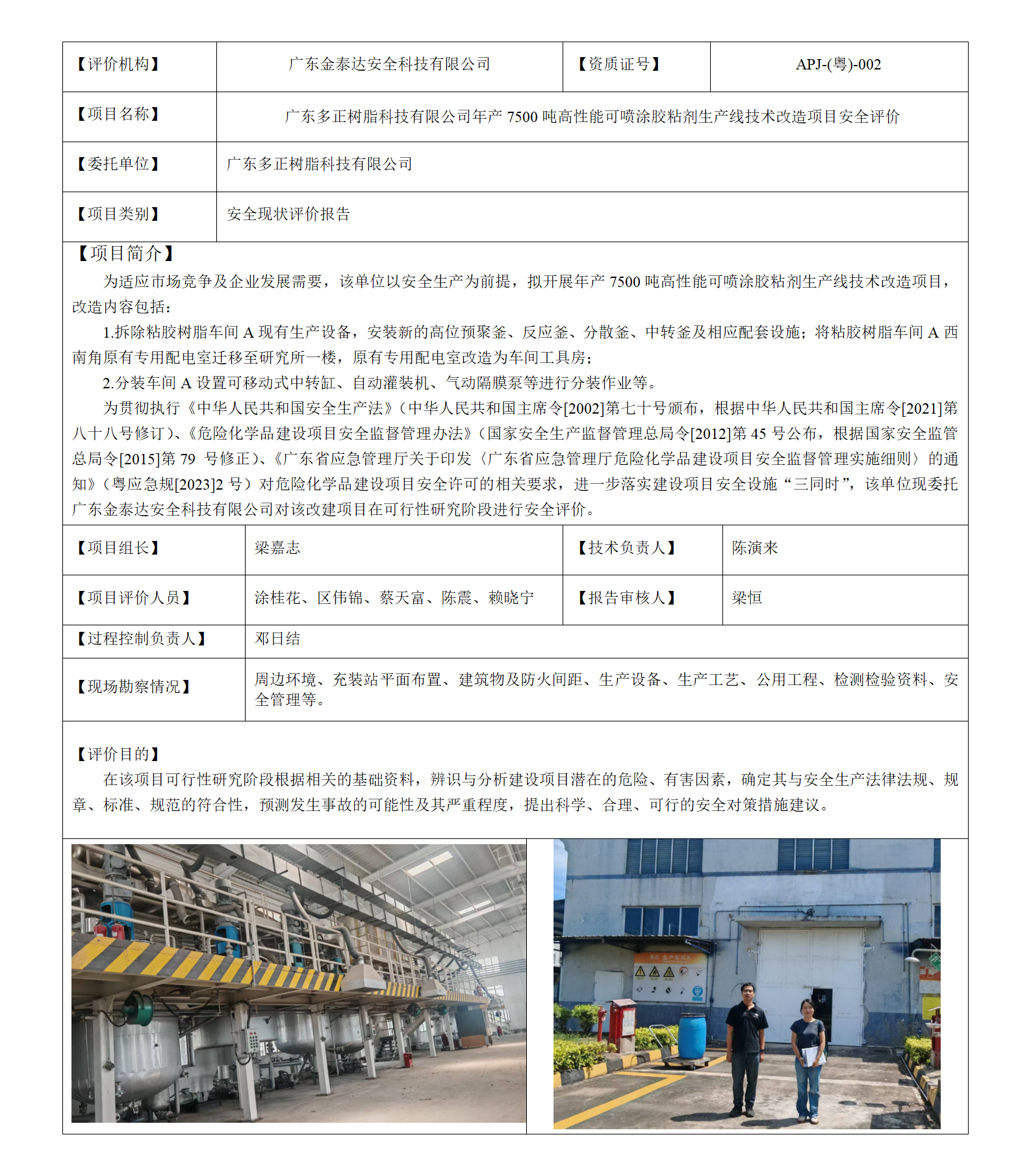 H25633广东多正树脂科技有限公司年产7500吨高性能可喷涂胶粘剂生产线技术改造项目安全评价信息公开表