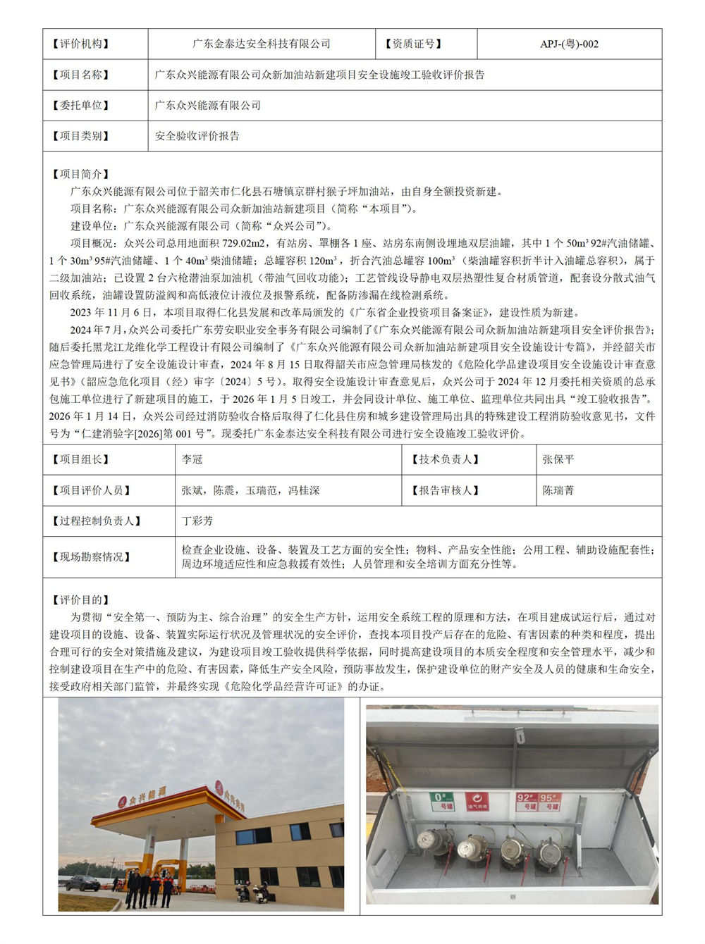 JTDG-AP2026-50广东众兴能源有限公司众新加油站新建项目安全设施竣工验收评价报告