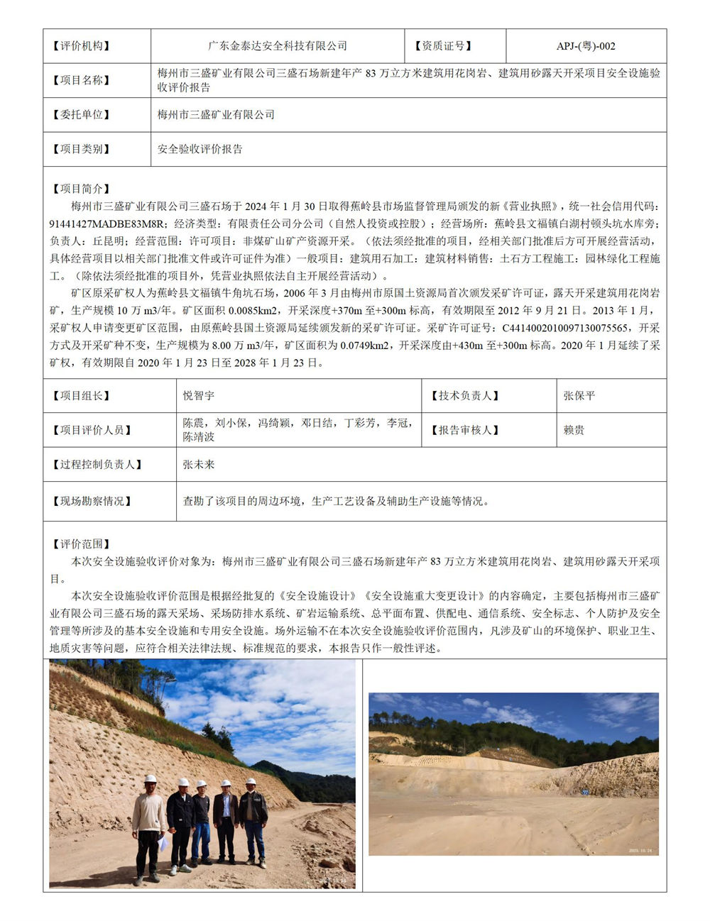 JTDG-KS2026-4梅州市三盛矿业有限公司三盛石场新建年产83万立方米建筑用花岗岩、建筑用砂露天开采项目安全设施验收评价报告